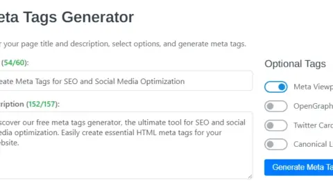 Discover our free meta tag generator, the ultimate tool for SEO and social media optimization. Easily create essential HTML meta tags including titles, descriptions, OpenGraph for Facebook, Twitter Cards, and canonical links. Input your content, select options like custom images or viewport meta, and generate code instantly.